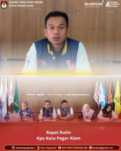 Jum'at 13 Februari Tahun 2026 Sekretariat KPU Kota Pagar Alam melaksanakan rapat rutin internal bertempat di Ruang Rapat KPU Kota Pagar Alam. Rapat dipimpin langsung oleh Sekretaris KPU Kota Pagar Alam, Nata Oktari, serta diikuti oleh jajaran Kasubbag dan staf sekretariat. Rapat ini dilakukan dalam rangka koordinasi pelaksanaan program kerja serta penguatan kinerja di lingkungan Sekretariat KPU Kota Pagar Alam. ....