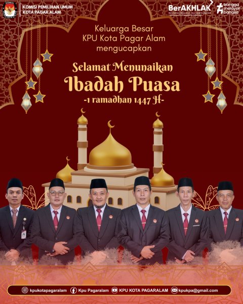 , Marhaban ya Ramadhan Keluarga Besar KPU Kota Pagar Alam mengucapkan: Selamat Menunaikan Ibadah Puasa 1447 H Semoga di bulan yang penuh keberkahan ini, kita senantiasa diberikan kekuatan, kesabaran, dan ketaqwaan dalam menjalankan ibadah. Mari jadikan momentum Ramadhan untuk mempererat tali silaturahmi. ....