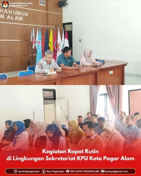 Senin 22 September 2025 KPU Kota Pagar Alam Melaksanakan Kegiatan Rapat Rutin dijajaran Sekretariat KPU Kota Pagar Alam, dengan Pemimpin Rapat Kasubag SDM dan Parmas KPU Kota Pagar Alam Handika didampingi jajaran Kasubag. Turut hadir  jajaran Kasubbag,Serta Seluruh ASN Sekretariat KPU Kota Pagar Alam.