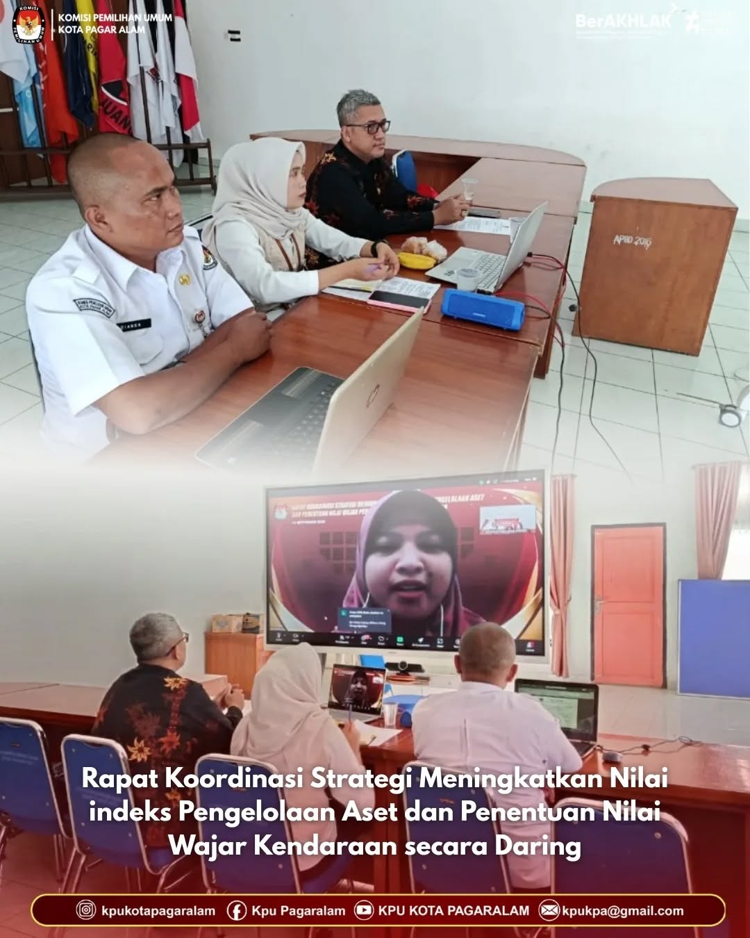 Kasubbag Keuangan, Umum dan Logistik Mashur Hendri beserta staf mengikuti Rapat Koordinasi Strategi Meningkatkan Nilai Indeks Pengelolaan Aset Dan Penentuan Nilai Wajar Penjualan Kendaraan secara daring yang dilaksanakan oleh KPU Republik Indonesia melalui Biro Pengadaan Barang/Jasa dan Barang Milik Negara (BMN).