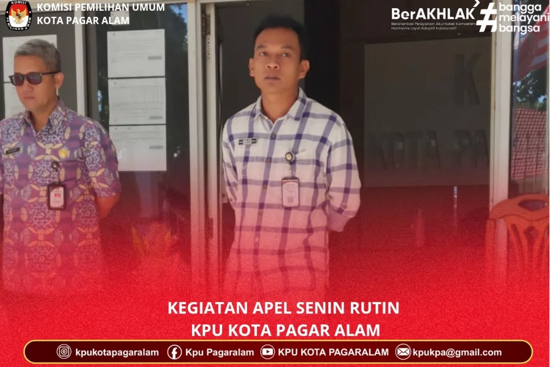 KPU Kota Pagar Alam Melaksanakan Kegiatan Apel Senin Pagi dijajaran Sekretariat KPU Kota Pagar Alam, dengan Pembina Apel Sekretaris KPU Kota Pagar Alam Nata Oktari didampingi jajaran Kasubag.
