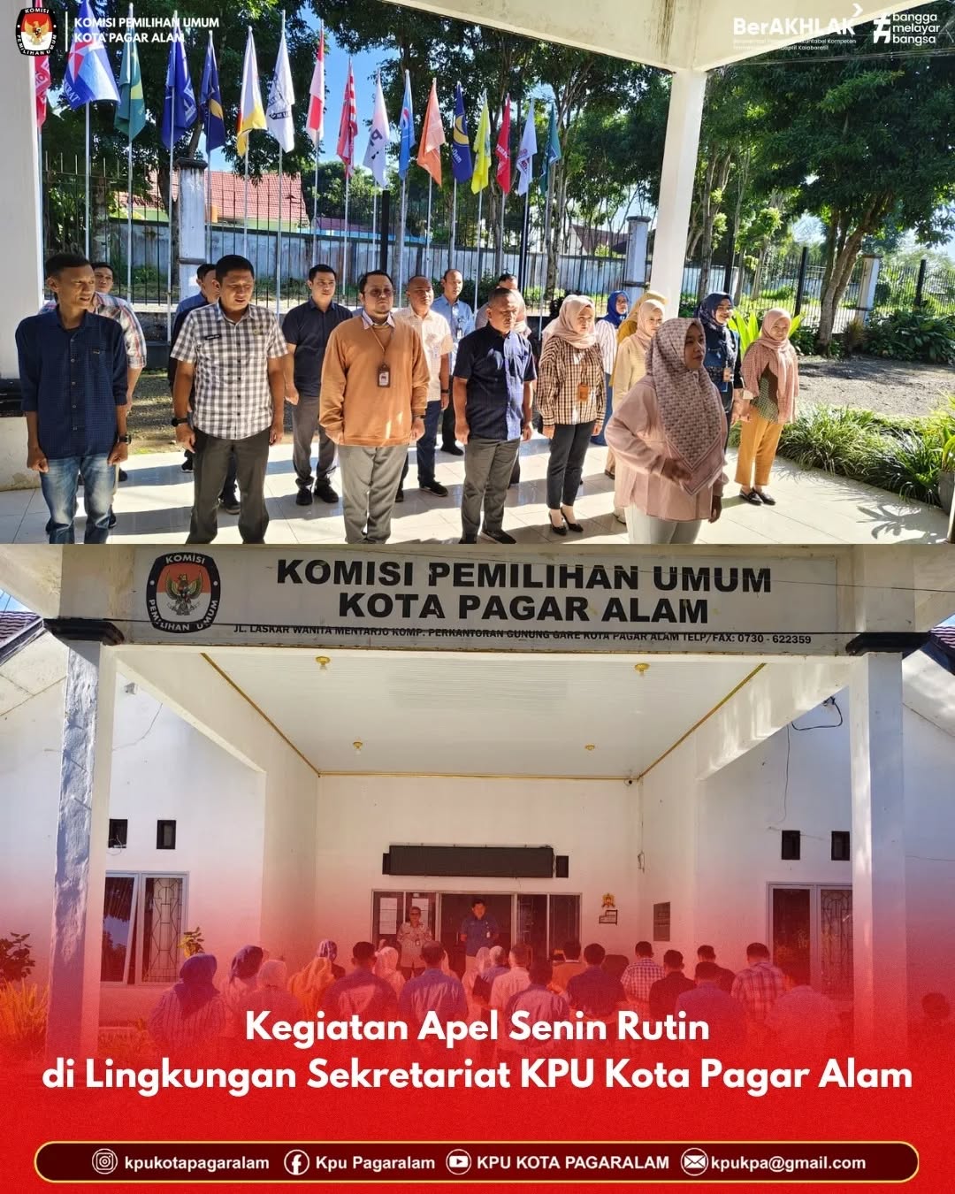 Senin 22 September 2025 KPU Kota Pagar Alam Melaksanakan Kegiatan Apel Senin Pagi dijajaran Sekretariat KPU Kota Pagar Alam, dengan Pembina Apel Kasubag SDM dan Parmas KPU Kota Pagar Alam Handika didampingi jajaran Kasubag.