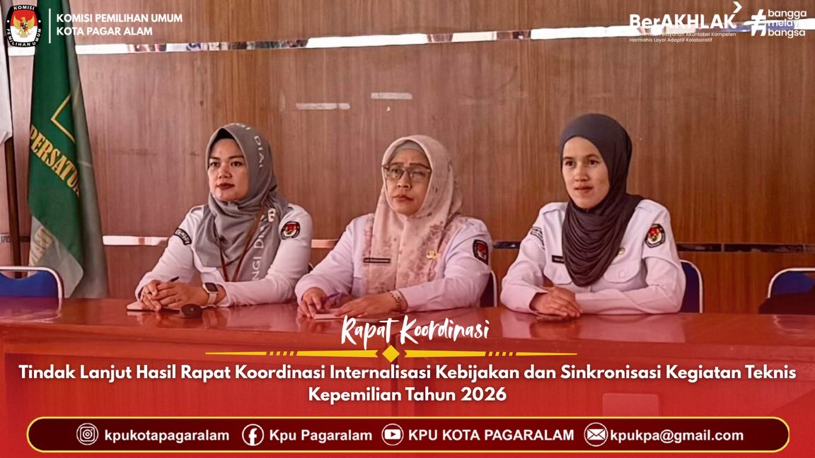 Rapat Koordinasi Tindak Lanjut Hasil Rapat Koordinasi Internalisasi Kebijakan dan Sinkronisasi Kegiatan Teknis Kepemiluan Tahun 2026 Senin, 09 Februari 2026 11:22 63 Senin, 09 Februari 2026 - Kasubbag Teknis Penyelenggaraan Pemilu dan Hukum, Ibu Lia Sundariani, beserta jajaran staf mengikuti Rapat Koordinasi Tindak Lanjut Hasil Rapat Koordinasi Internalisasi Kebijakan dan Sinkronisasi Kegiatan Teknis Kepemiluan Tahun 2026 secara daring melalui Zoom Meeting. Kegiatan ini merupakan langkah strategis dalam memperkuat koordinasi serta memastikan seluruh kebijakan teknis kepemiluan tersinkronisasi dengan baik di seluruh lini. Bagikan: Telah dilihat 63 kali