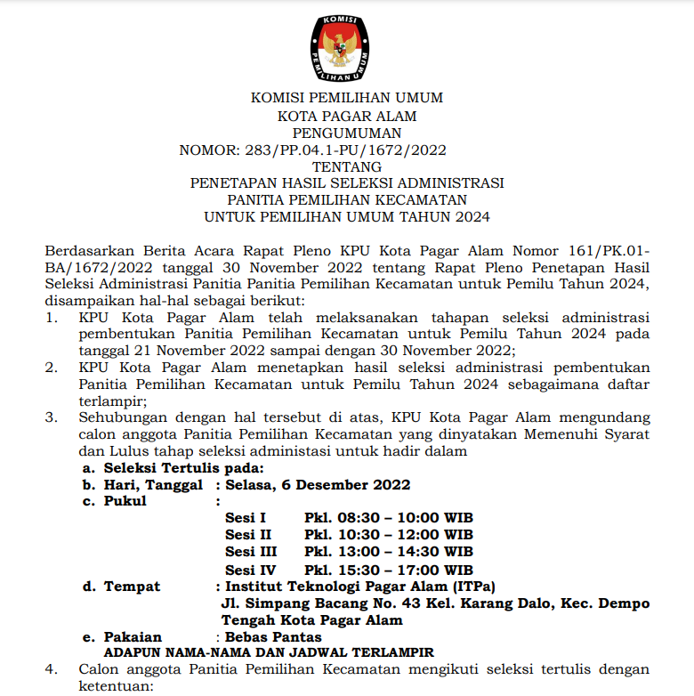 PENETAPAN HASIL SELEKSI ADMINISTRASI PANITIA PEMILIHAN KECAMATAN UNTUK PEMILIHAN UMUM TAHUN 2024 TINGKAT KPU KOTA PAGAR ALAM