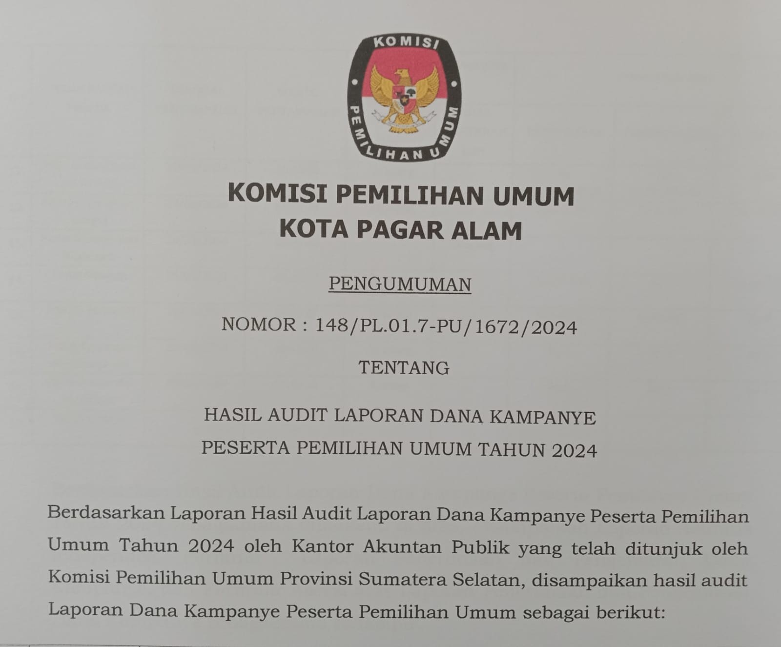 PENGUMUMAN HASIL AUDIT LAPORAN DANA KAMPANYE PESERTA PEMILIHAN UMUM TAHUN 2024