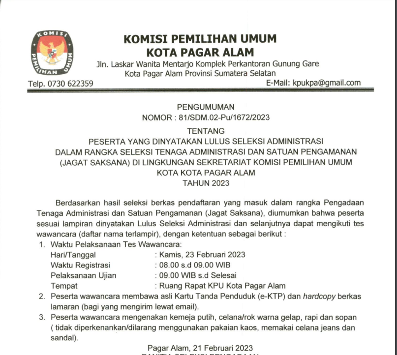 PENGUMUMAN HASIL SELEKSI ADMINISTRASI TENAGA ADMINISTRASI DAN SATUAN PENGAMANAN (JAGAT SAKSANA) DI LINGKUNGAN SEKRETARIATKOMISI PEMILIHAN UMUM KOTA PAGAR ALAM TAHUN 2023