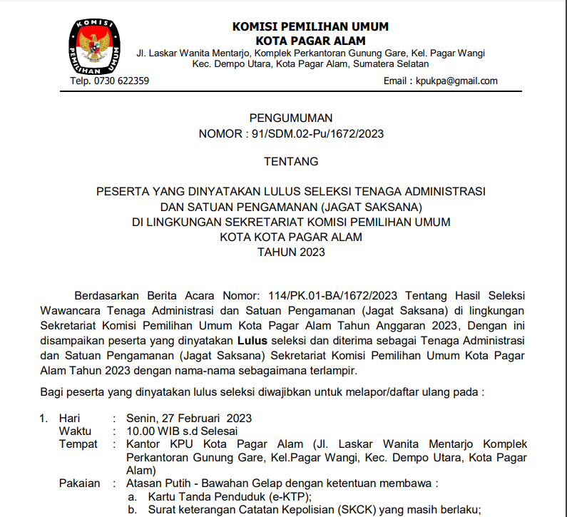 PENGUMUMAN HASIL SELEKSI TENAGA ADMINISTRASI DAN SATUAN PENGAMANAN (JAGAT SAKSANA) DI LINGKUNGAN SEKRETARIATKOMISI PEMILIHAN UMUM KOTA PAGAR ALAM TAHUN 2023