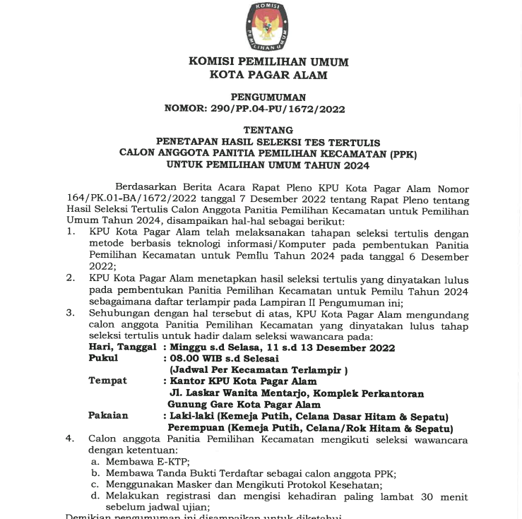PENGUMUMAN HASIL SELEKSI TERTULIS MENGGUNAKAN COMPUTER ASSISTED TEST (CAT) PANITIA PEMILIHAN KECAMATAN UNTUK PEMILIHAN UMUM TAHUN 2024