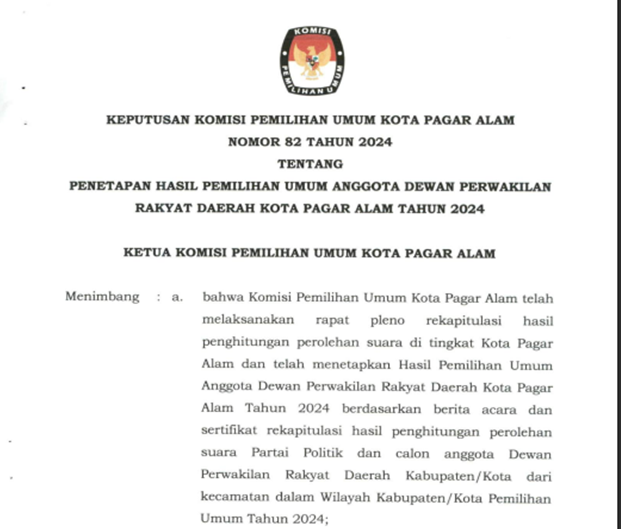 PENGUMUMAN PENETAPAN HASIL PEMILIHAN UMUM ANGGOTA DEWAN PERWAKILAN RAKYAT DAERAH KOTA PAGAR ALAM TAHUN 2024