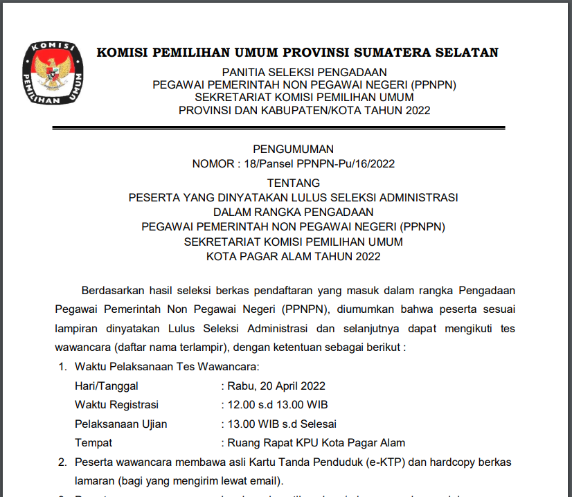 PENGUMUMAN PESERTA YANG DINYATAKAN LULUS SELEKSI ADMINISTRASIPPNPN SEKRETARIAT KPU KOTA PAGAR ALAM TAHUN 2022