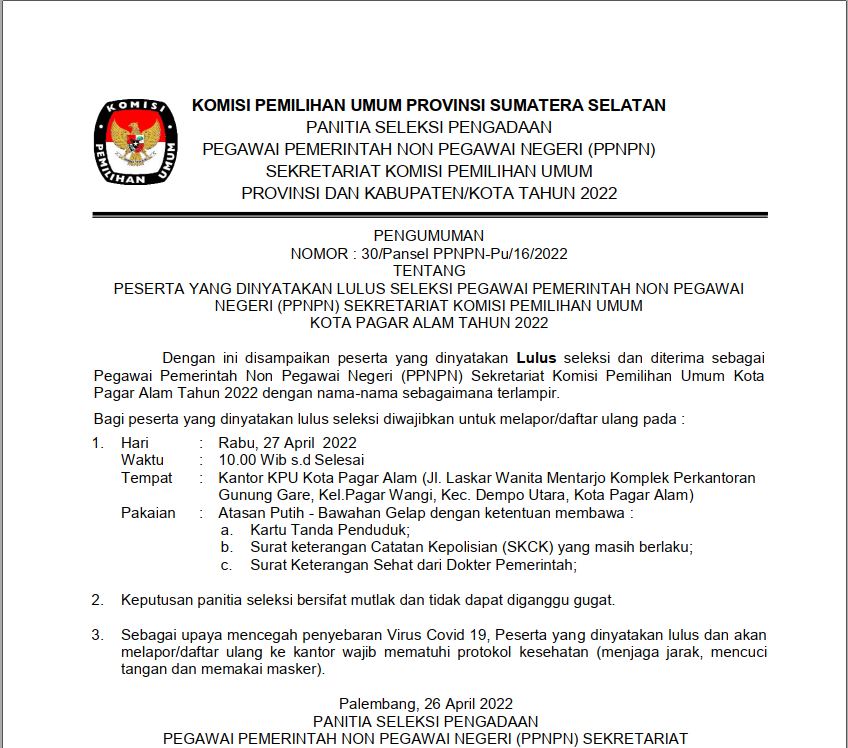 PENGUMUMAN PESERTA YANG DINYATAKAN LULUS SELEKSI PPNPN SEKRETARIAT KPU KOTA PAGAR ALAM TAHUN 2022