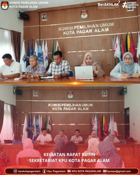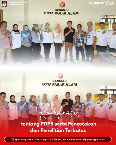 KPU Kota Pagar Alam melakukan Koordinasi tentang Pemutakhiran Data Pemilih Berkelanjutan (PDPB) serta Pencocokan dan Penelitian Terbatas (Coklit) dihadiri oleh Ketua KPU, Bapak Ibrahim Putra, Divisi Perencanaan Data dan Informasi, Bapak Ihwan Nopri, serta Kasubag Rendatin beserta staf Rendatin ke kantor Bawaslu Kota Pagar Alam.